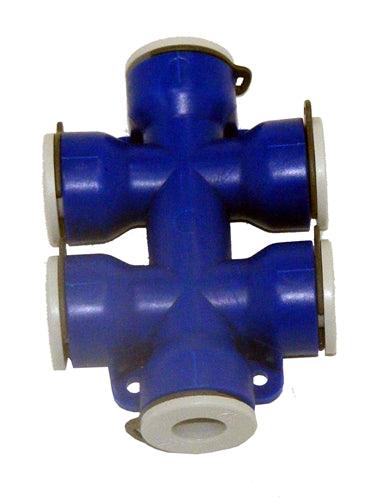 6-vägskoppling UniQuick. UniQuick snabbkopplingssystem för vattenledningar har flera fördelar: Tillverkat av speciellt material som uppfyller de senaste kraven från myndigheterna gällande dricksvatten. Inte bara för temperaturer upp till 60?C, utan även upp till 90?C. Installationen görs enkelt genom att vattenledningen förs in i Uniquick-kopplingen som låser slang och tätar. Kan enkelt lossas och användas igen. Är 100% täta upp till hela 6 bar och 80?C. OBS! Inte frostsäkert. Böjbara slangar som ej veckas och hindrar vattenflödet. Tack vare kopplingarnas utformning hindras inte vattenflödet.