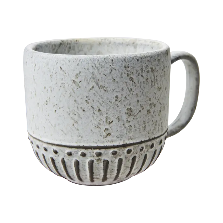 Här har du en trevlig mugg i stengods som går i färgerna Grått och Elfenben. Muggen har lite grövre ränder och prickar på nedre delen av muggen. Muggen som har ett greppvänligt öra är matcertifierad, tål maskindisk, mikro och ugn.