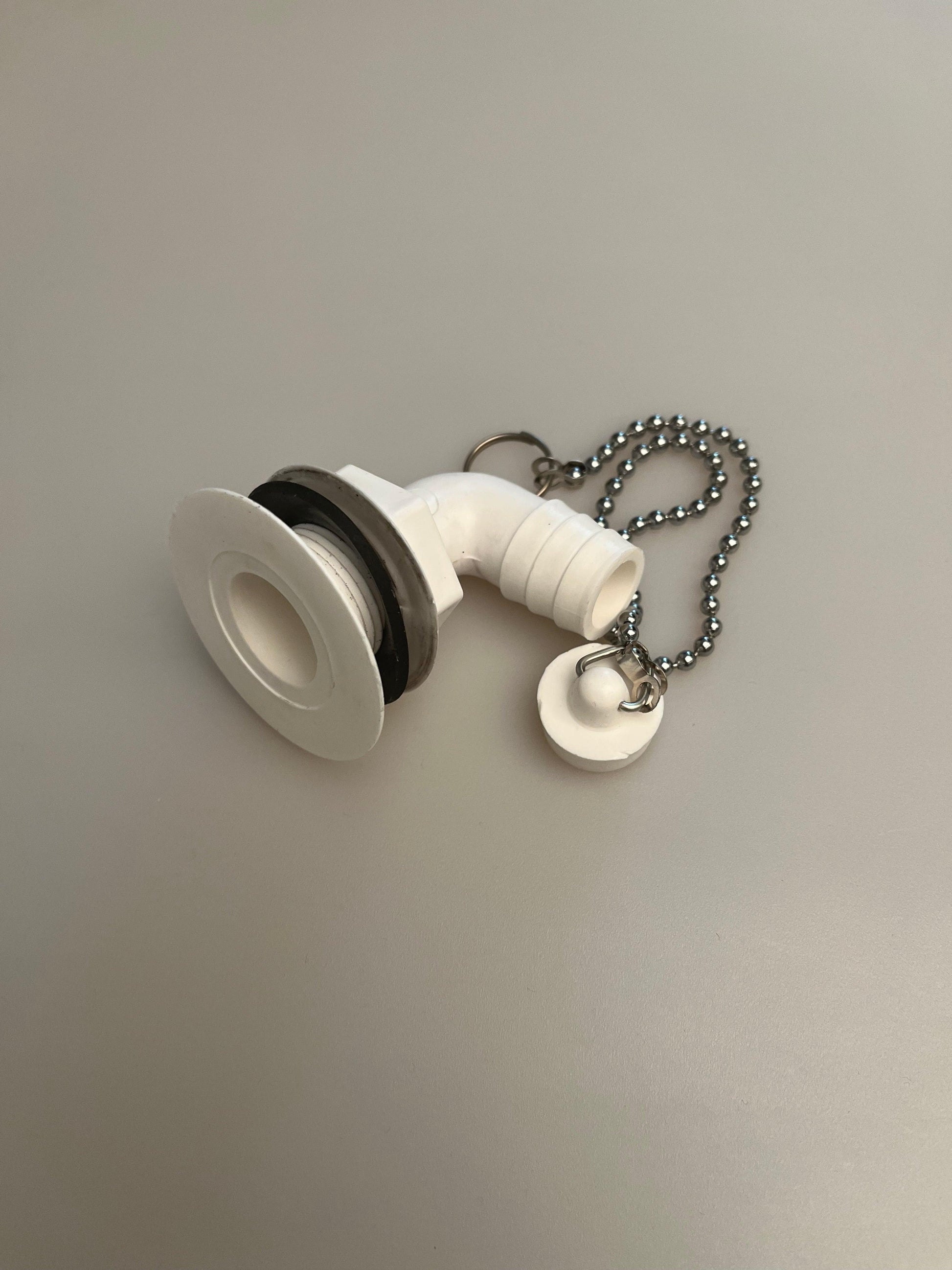 Avloppsbeslag med kedja och propp. Anslutning: Ø 19 mm.