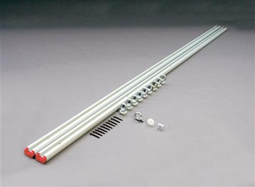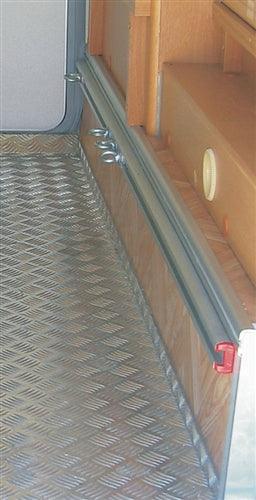 Garage Bars - transportsäkringsskenor för montering i husbilens bagerum. Tillverkade av aluminium. Med 5 st justerbara fästöglor. Levereras i mått 40 x 25 x 200 cm och kan enkelt kapas till önskad längd. Kan kompletteras med 2 extra öglor (T03-47B).