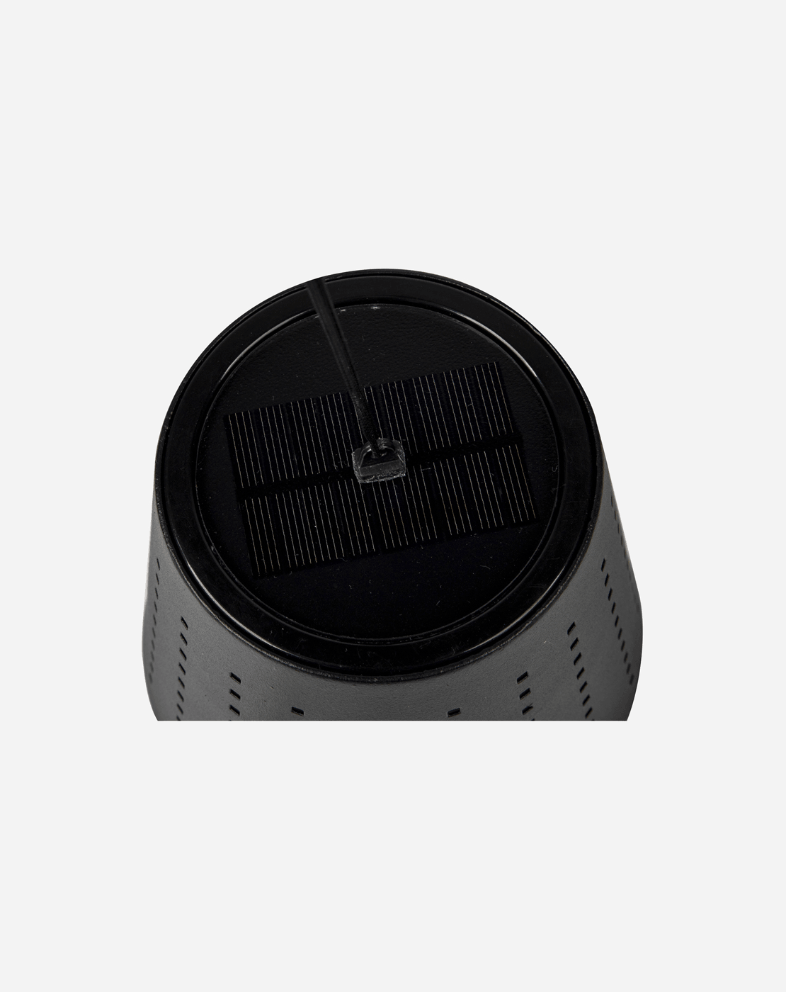 Stämningsfull solcellslampa LED av kraftigt stål med industriellt utseende. Varmvit LED-belysning med 3 ljuslägen (25 / 50 / 100%). Det inbyggda Li-ion-batteriet kan laddas med solenergi eller den medföljande USB-kabeln. Utrustad med 4 timmars timer för automatiskt avstängning.