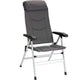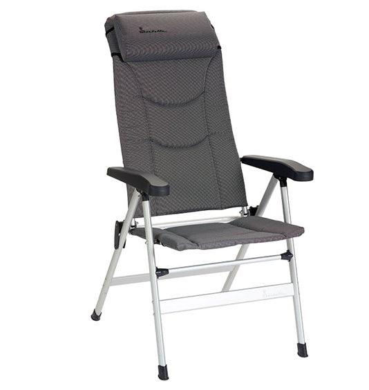 Campingstol Thor med 8 lägen, inkl. nackkudde. Alu-stativ. Material: Polyweave (60% PVC Coating / 40% Polyester). Vikt: 5,5 kg. Mått hopfälld: 118 x 63 x 14 cm. Max belastning: 120 kg. Färg: ljusgrå.