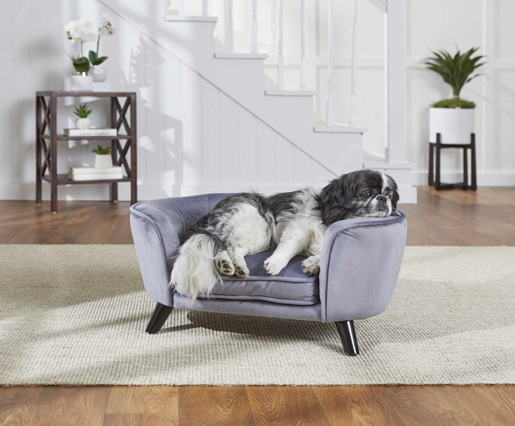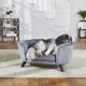 Romy Pewter soffan är en stilren och lyxig grå plysch soffa med svarta avsmalnande ben som höjer upp soffan för att hålla ditt husdjur från luftdrag medan den vilar. Den böjda ryggen ”Sleep Comfort Contour” gör att ditt husdjur kan känna sig säker och skyddad.