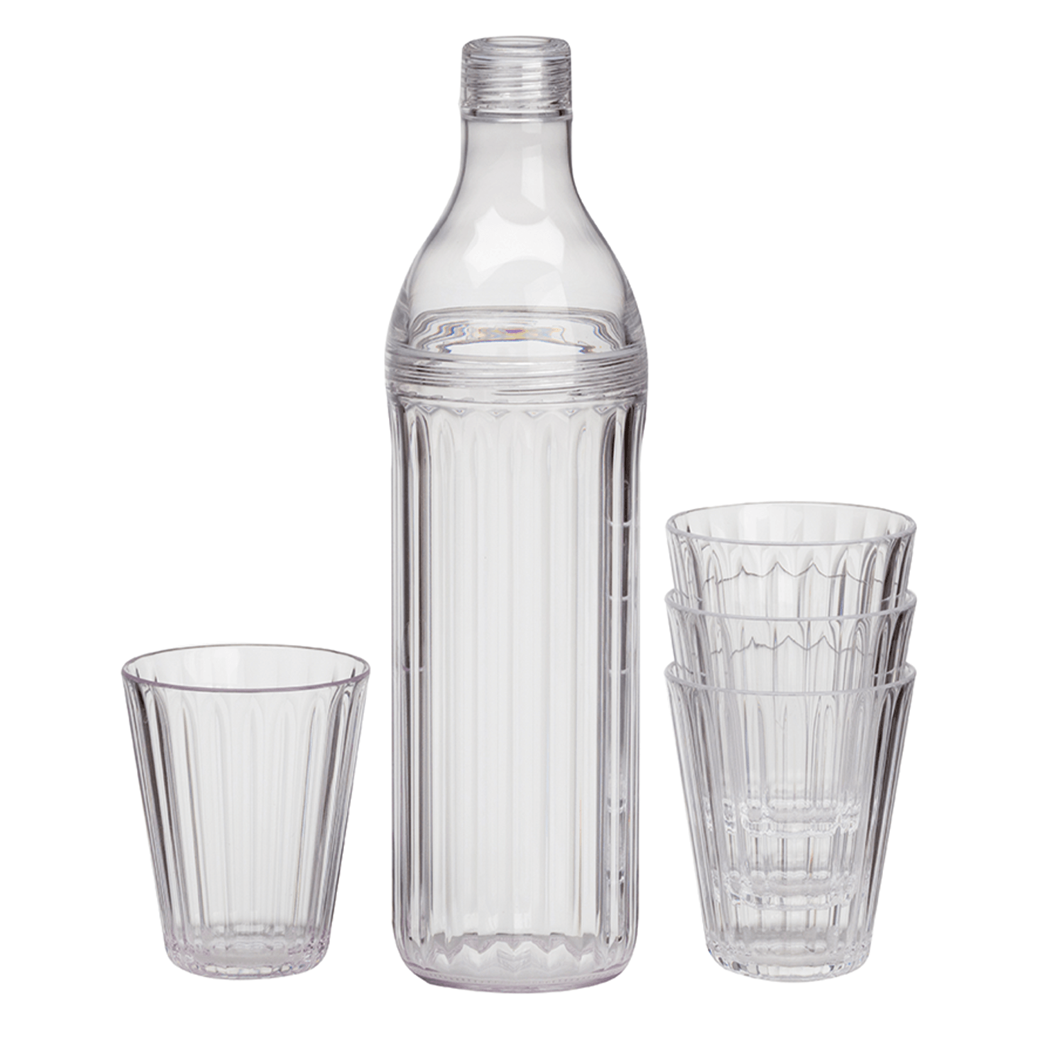 Tillbringare med 4 glas. Praktisk tillbringare med glas tillverkade i SAN-plast. Tillbringaren rymmer 102 cl. Glasen rymmer 26,5 cl.