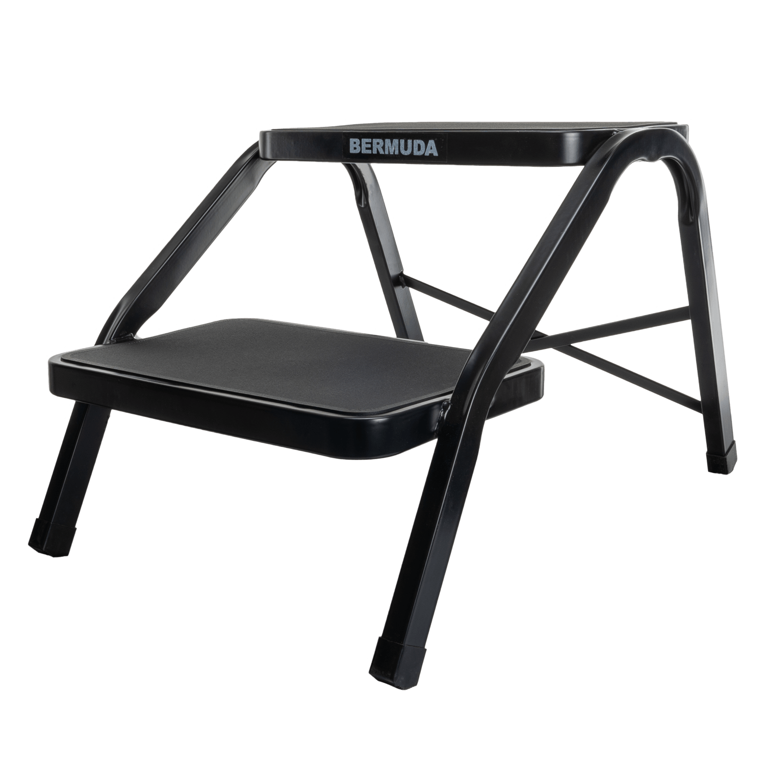 Bermuda dubbla fotsteg i stål är ett robust och oumbärligt tillbehör för husvagn, husbil eller båt. Med måtten 424 x 634 x 380 mm är Bermuda tillräckligt kompakt för smidig förvaring men ändå tillräckligt robust för att ge stabilt stöd.Bermuda klarar en maxbelastning av 150 kg. Dubbla steg gör det enkelt att ta sig in och ur fordonet eller båten. Den halkfria ytan i stegplattorna ser till att man säkert kan kliva upp/ner utan att halka. Benens nedre del har gummikåpor så att fotsteget står säkert även på glatta ytor. Färg: svart.
