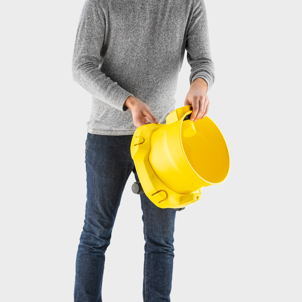 WD 2 Plus V imponerar med sin kompakta utformning och är både kraftig och energisnål – med en effektförbrukning på endast 1 000 W. Grovdammsugaren ger bästa rengöringsresultat för torr, våt, fin och grov smuts. Våt- och torrdammsugaren har en robust och slagtålig plastbehållare på 15 l, 4 m kabel samt 1,8 m lång sugslang med rakt handtag, golvmunstycke med klick-anslutning och fleecefilterpåse. Patronfiltret gör att torr och våt smuts kan dammsugas upp utan filterbyte. Dammsugaren har även en praktisk blåsfunktion, som kan användas på ställen där det är svårt att dammsuga. Förvaringsutrymmet på maskinens släta ovansida används för smidig förvaring av verktyg och smådelar. Dammsugarrör och golvmunstycken kan också snabbt och bekvämt placeras i parkeringspositionen. Utöver detta har maskinen platssparande förvaring, enkel tillbehörsförvaring, Pull & Push-låssystem samt ergonomiskt utformat bärhandtag för bekväm transport.