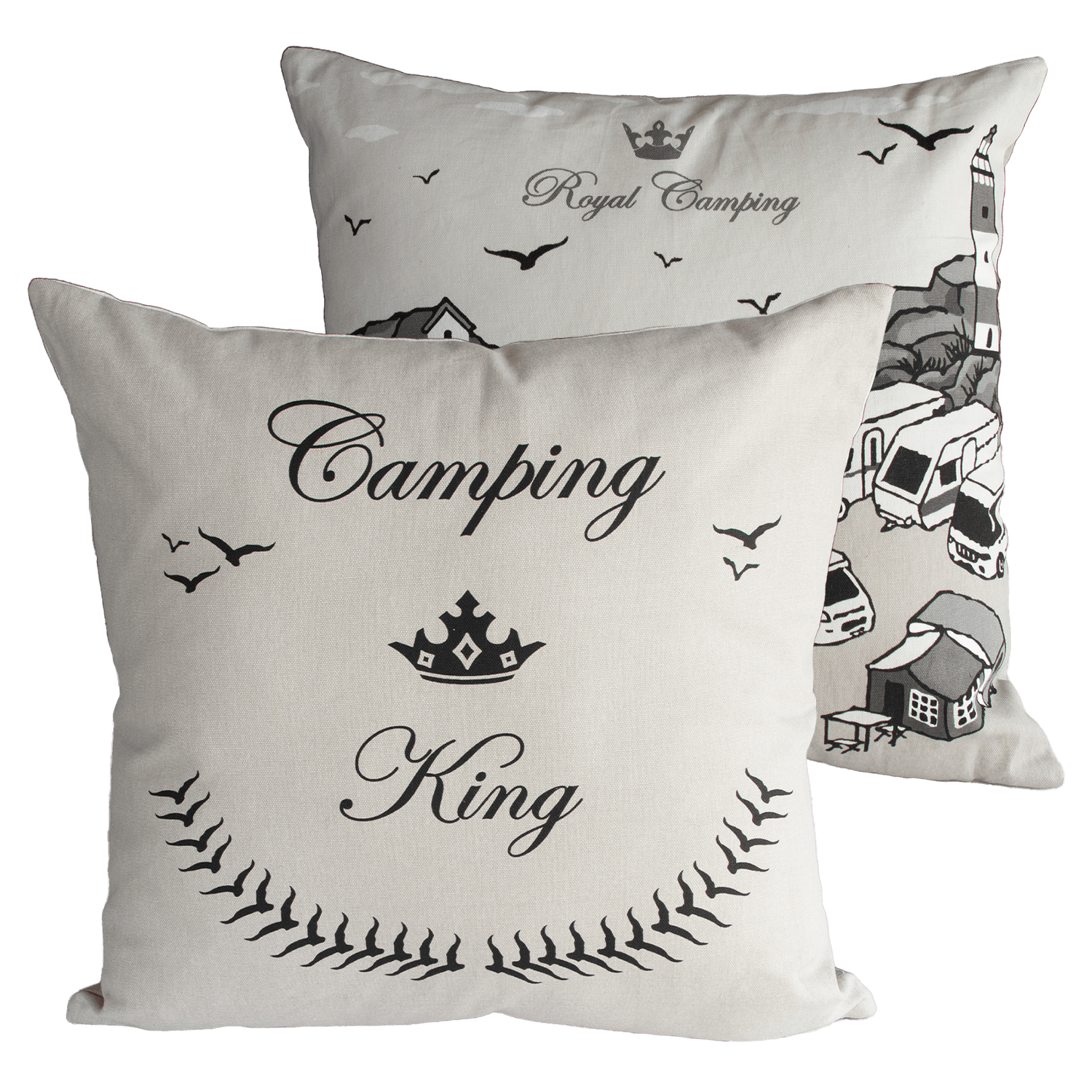 En härlig kudde med elegant campingmotiv på ena sidan och Camping King på andra sidan. Yttertyg i 100% bomull, 350 g fyllning i polyester. Mått: 45 x 45 cm.
