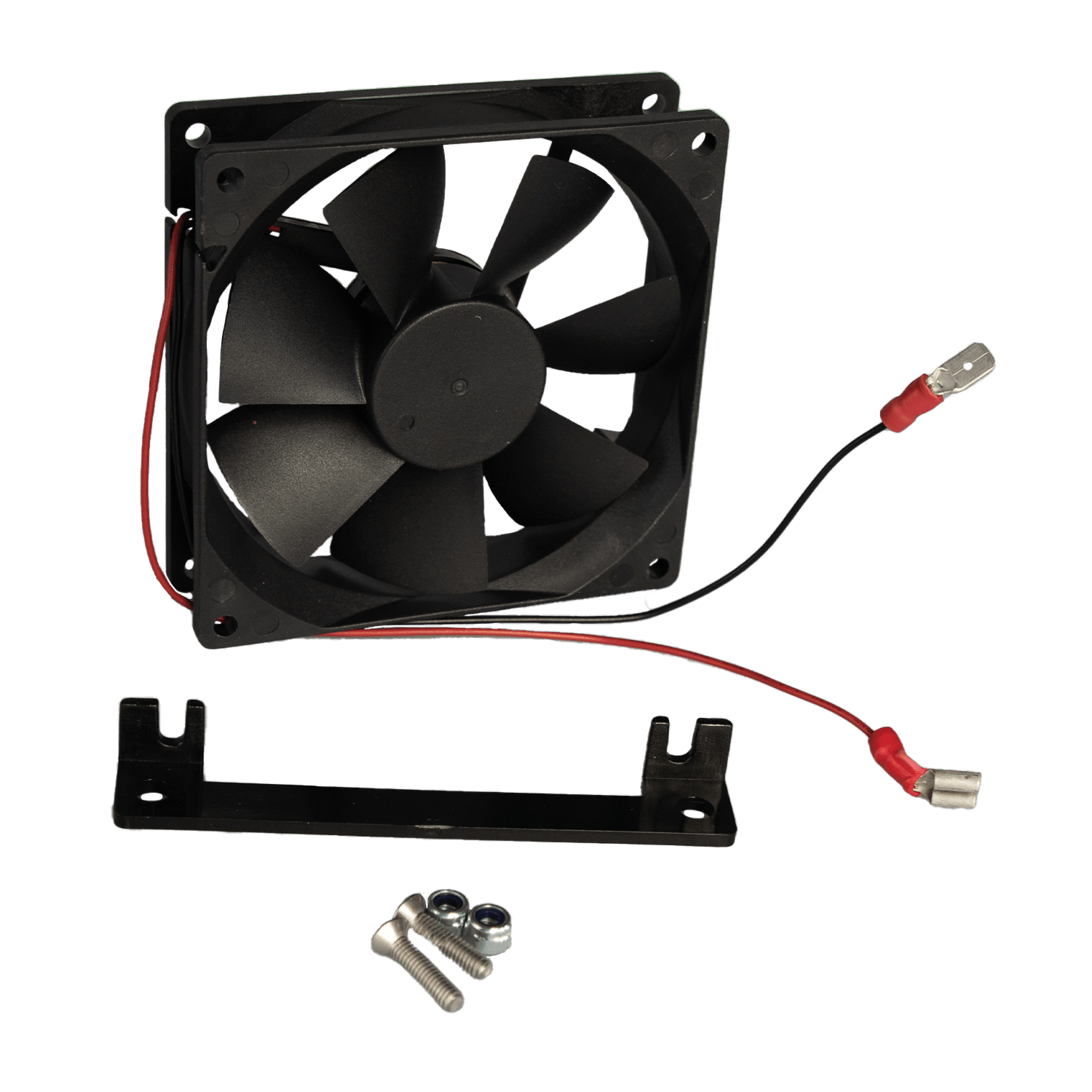 Kylskåpsfläkt, störningsfri. Termostat gör att fläkten startar automatiskt när för hög temperatur uppnås bakom kylskåpet. 90 x 90 x 15 mm.