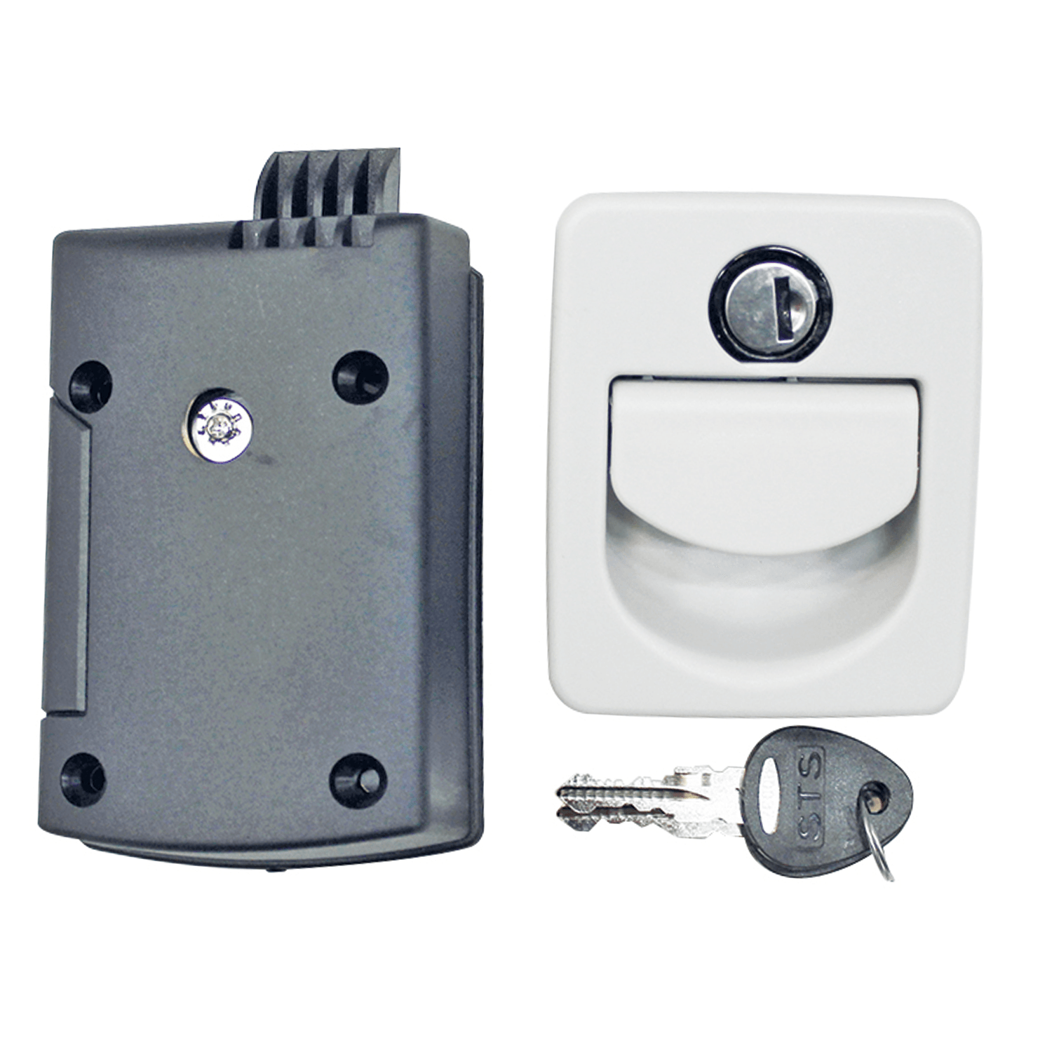 Lås för 40 mm dörr. Färg: Fiat Bianco. Mått ytterdel: 95 x 70 mm.