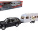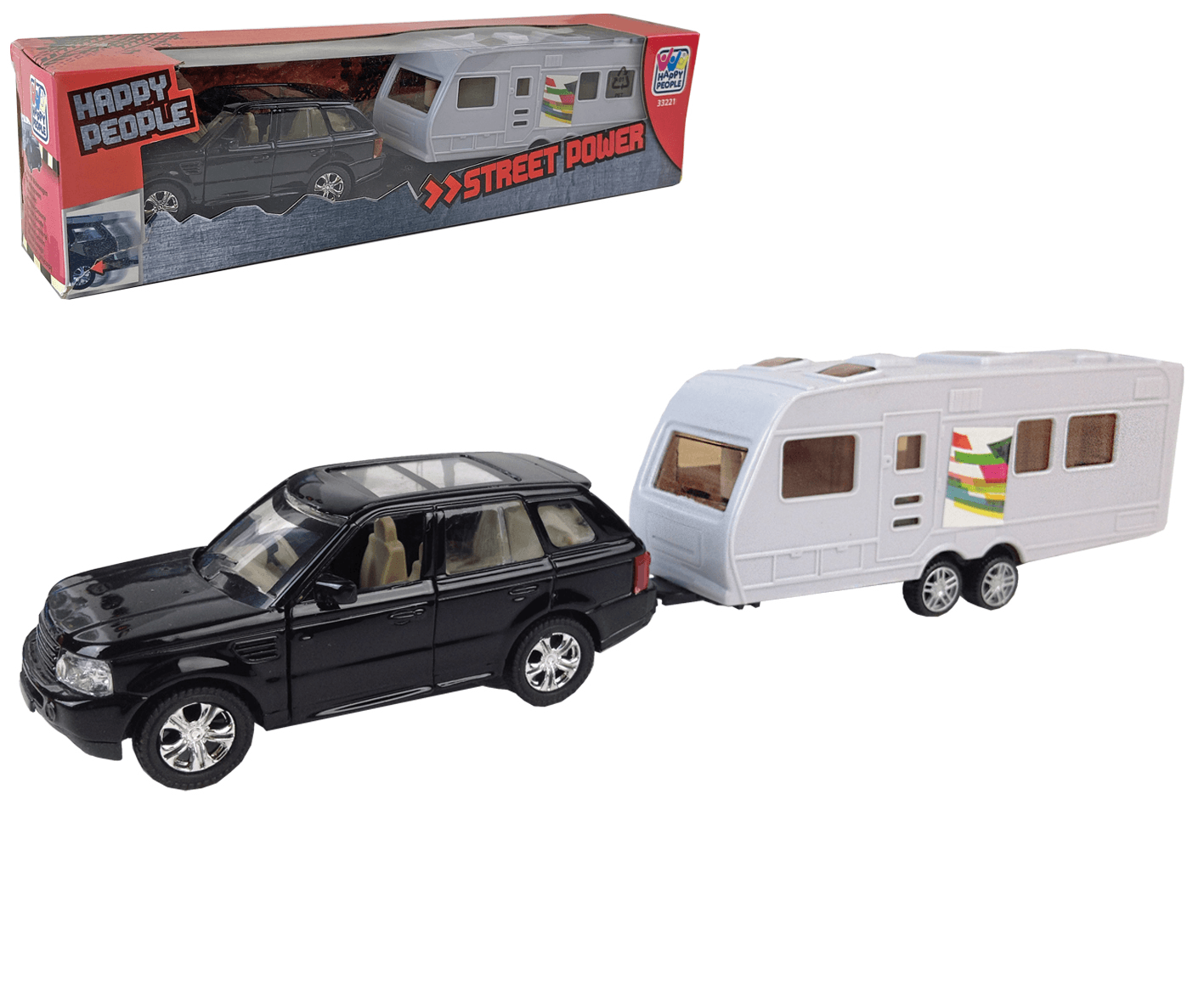 Leksaksbil (12 cm) med husvagn (18 cm) som kan kopplas loss. Bilen har öppningsbara dörrar.