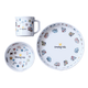 Servis tillverkad av lätt och tålig melamin. Servisen består av 1 st tallrik (Ø 178 mm), 1 st skål (Ø 111 mm) och 1 st mugg (Ø 73 mm). Med anti-slip undersida. Tål maskindisk (max 70˚C) – använd ej i mikrovågsugn.