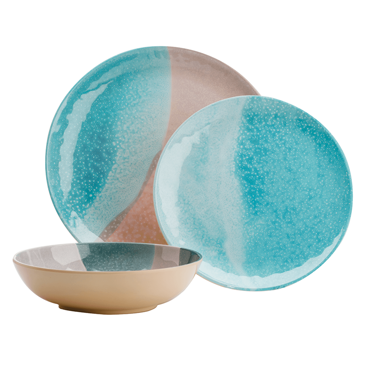 En modern melaminservis med en präglad skinande yta som ger en känsla av stengods men med vikt som melamin. Servisen består av 4 st skålar (Ø 150 mm), 4 st assietter (Ø 200 mm) och 4 st flata tallrikar (Ø 250 mm). Med anti-slip. Tål maskindisk (max 70˚C) – använd ej i mikrovågsugn.