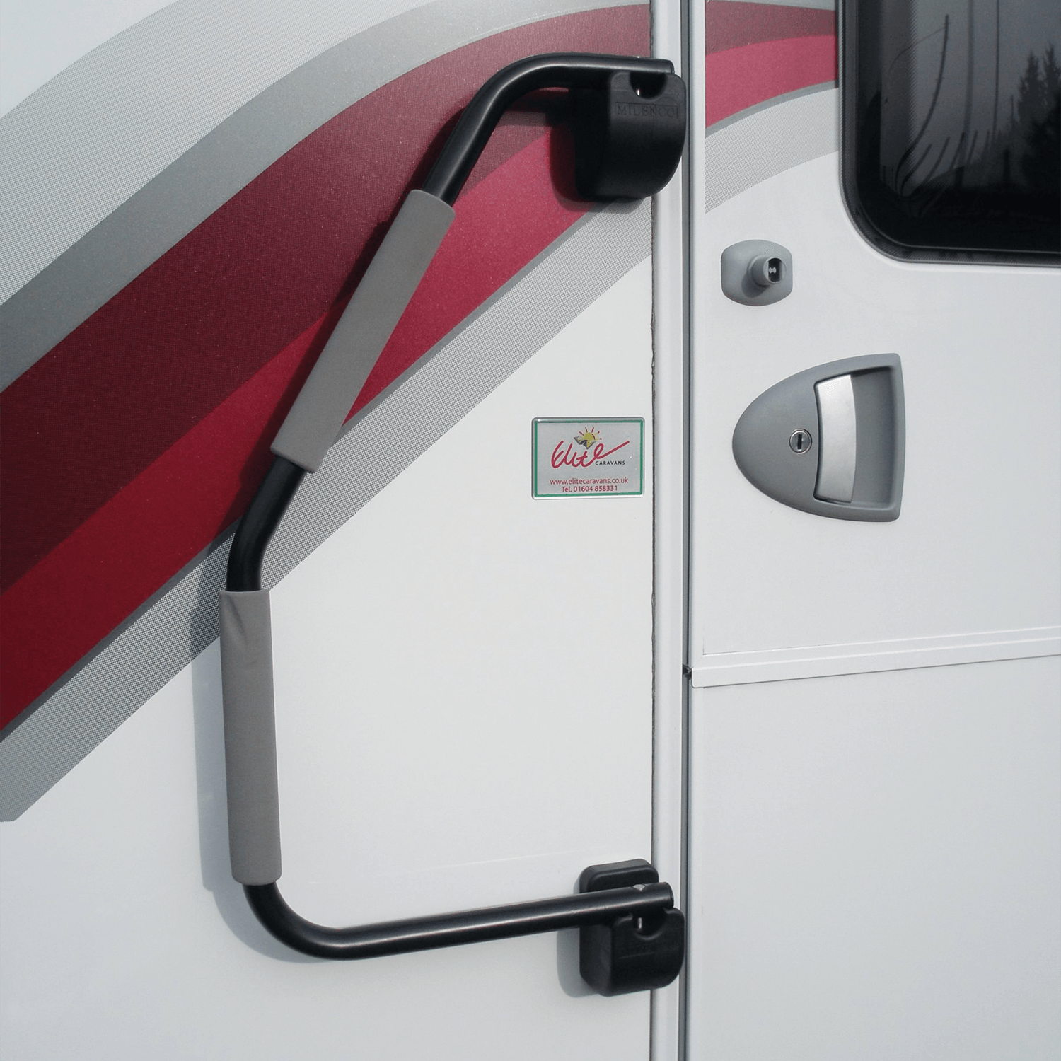 Milenco instegshandtag underlättar vid insteg i husvagn eller husbil. Handtagen är enkla att montera med endast 4 st skruvar från ut- eller insida av karossväggen. Beslagen är av rostfritt stål. Instegshandtagen är ej låsbara.
