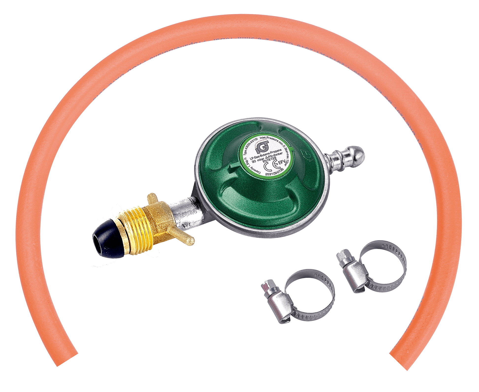 Reduceringsventil, 30 mbar (3 kPa). Vänstergängad polanslutning för 5-45 kg gasolflaskor. Slangnippel för Ø 8 mm gasolslang. Levereras med 80 cm gasolslang och slangklämmor.