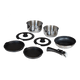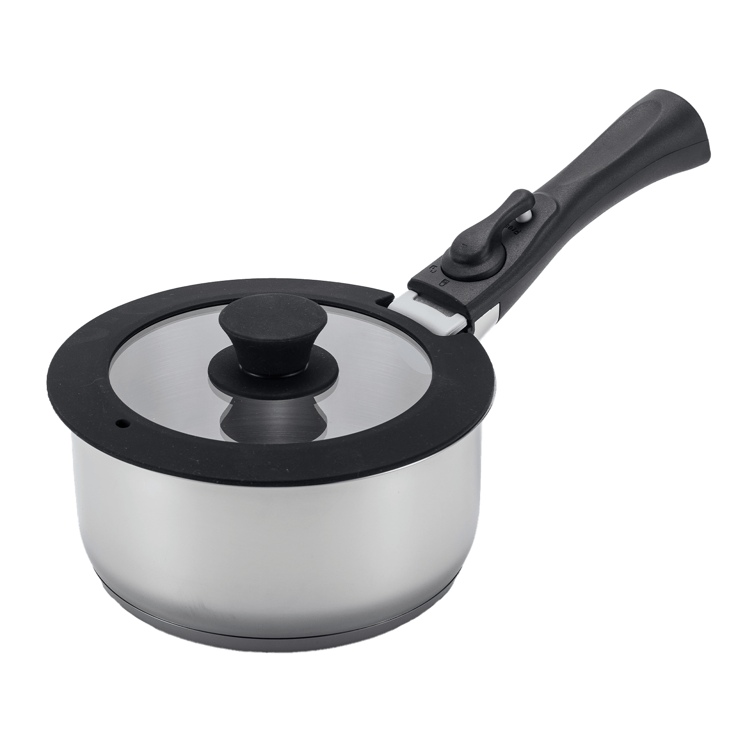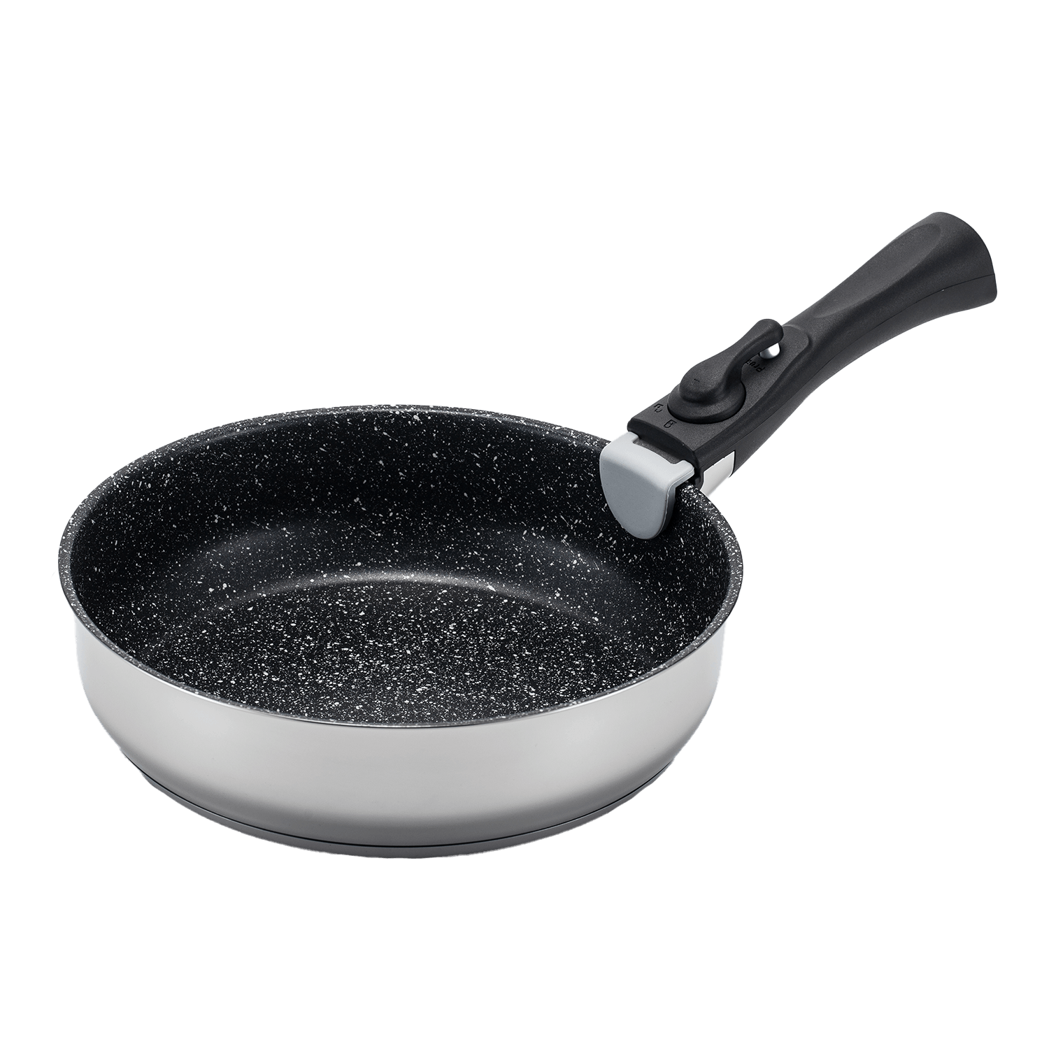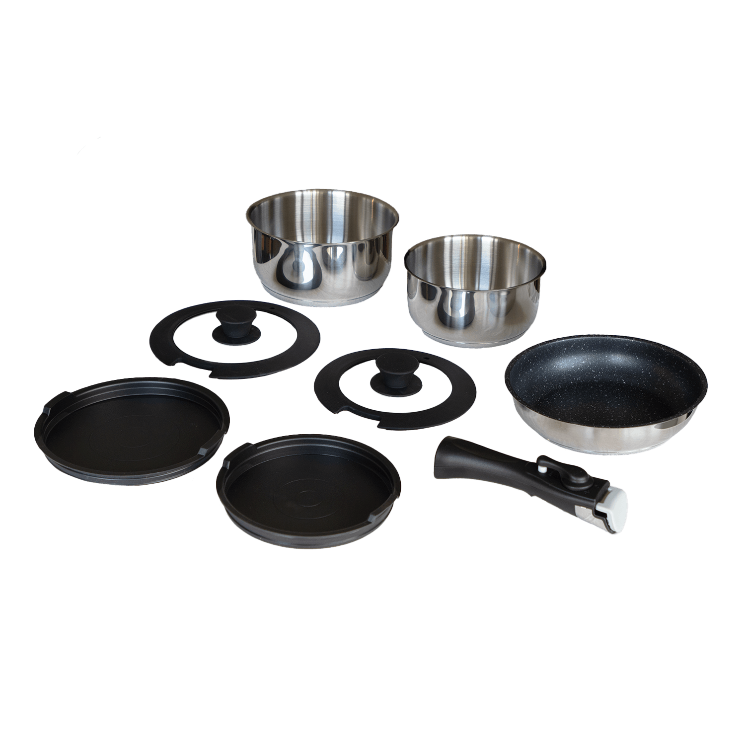 Kastrullset med non-stick-beläggning. Kan användas på gas-, el-, halogen-, keramisk eller induktionshäll. Med avtagbart handtag. Vikt: 2,3 kg.