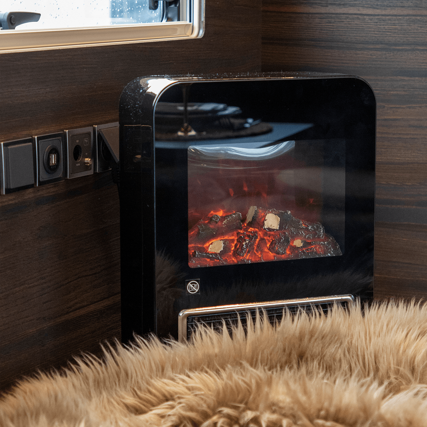 Elegant värmefläkt med dekorationsbrasa som förhöjer mysfaktorn. 2 värmelägen med termostat eller bara dekorationsbrasa.