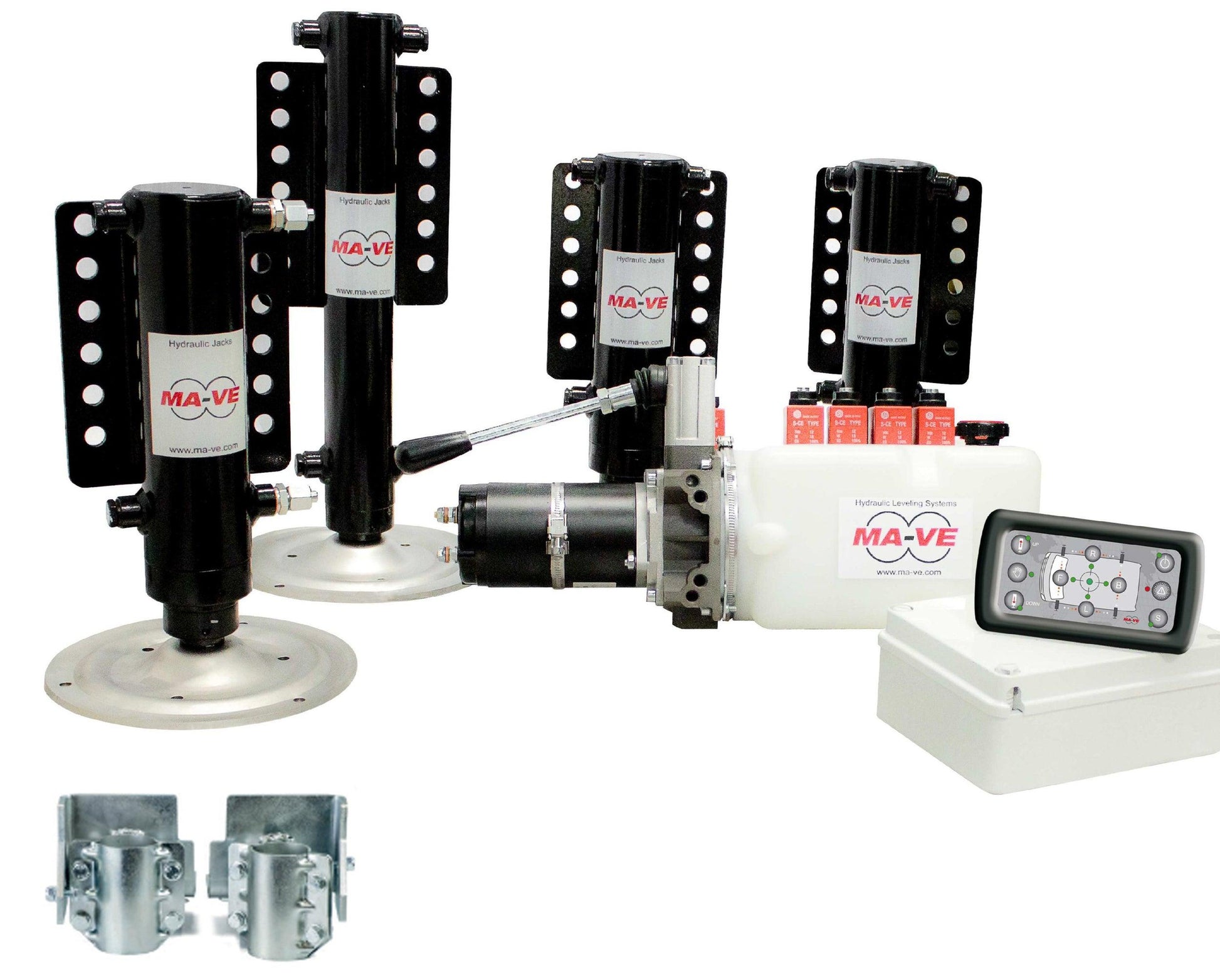 MA-VE använder en elektrohydraulisk 12V pump och en säkerhetspump för att fälla in stödbenen ifall hydrauliken inte fungerar. Stödbenen finns i olika utförande beroende på vilken typ av fordon man har. Alla stödben har en stor fot av rostfritt stål som ser till att den inte sjunker ner i marken. Alla stödben har 5 lager färg för bättre hållbarhet över tid.