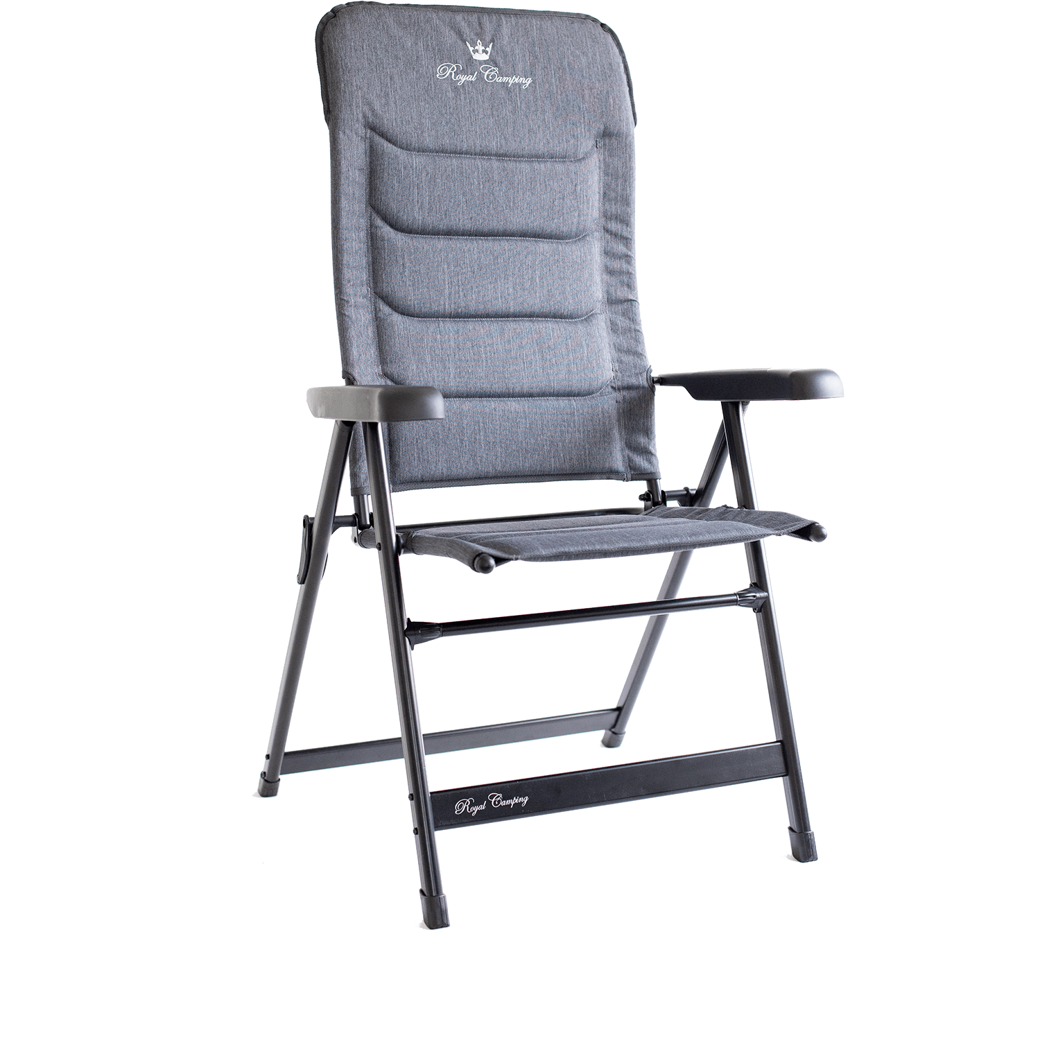 Stol Regent. Stålgrå. Hopfällbar campingstol med stoppad dyna som ger mycket hög komfort. Hög rygg och 6 positionsinställningar med en härlig sittkomfort. Stativet är pulverlackerat för bästa hållbarhet. Den unika konstruktionen gör att stolen endast blir 8 cm tjock i hopfällt läge. Stolen är tillverkad av ovala aluminiumprofiler i dimension 35 x 22 mm och 45 x 14 mm och rör med Ø 22 mm. Med väderokänslig klädsel i polyester.