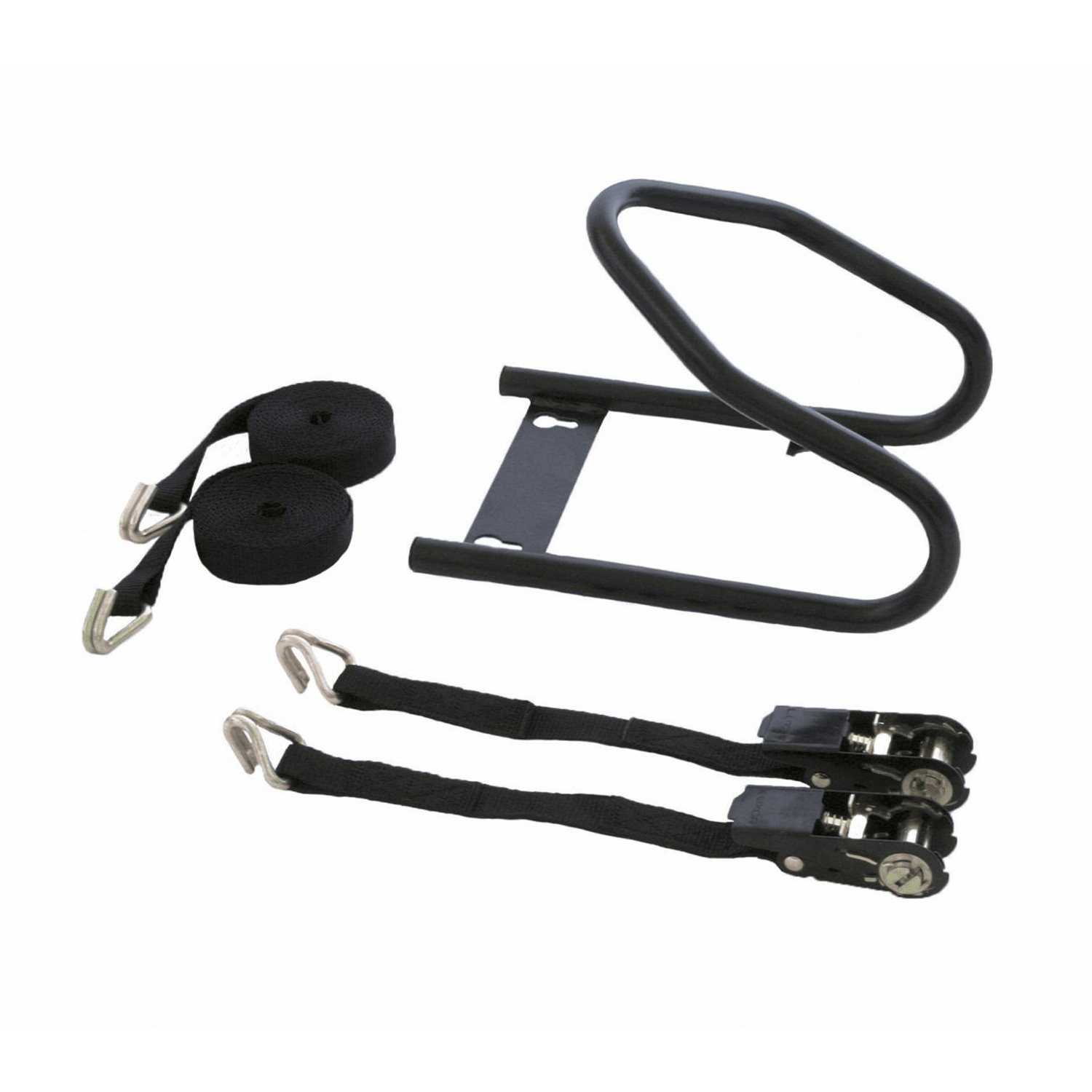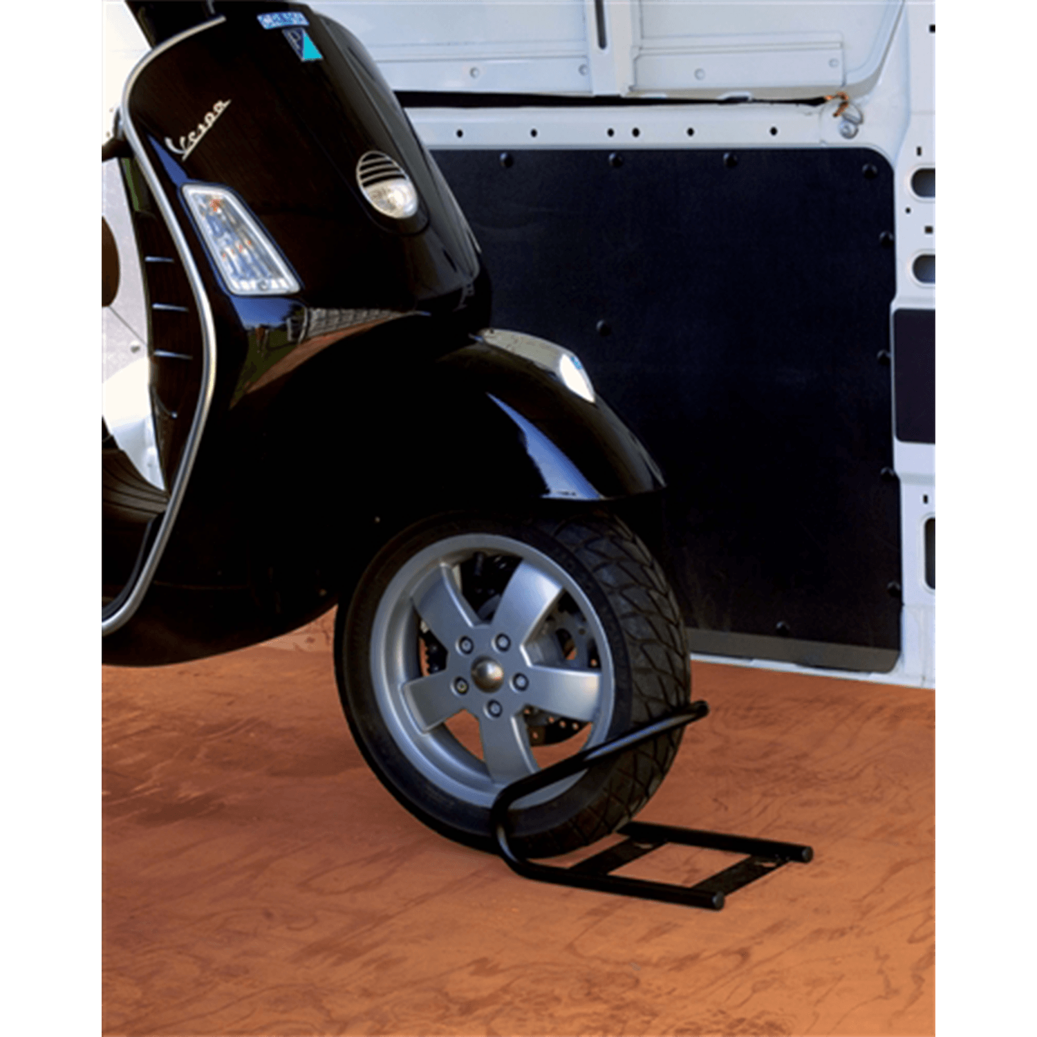 FIAMMA STOPPKLOSS FIAMMA Moto Wheel Chock - en robust och lätt stoppkloss i svartlackerat stål. Enkel montering tack vare de användarvänliga fästena med skruvar. Den avrundade designen gör att man kan stabilisera däck som är upp till 165 mm breda. Levereras med skruvsats för montering på trägolv. Satsen för främre hjulet innehåller spännremmar för att fästa fordonet