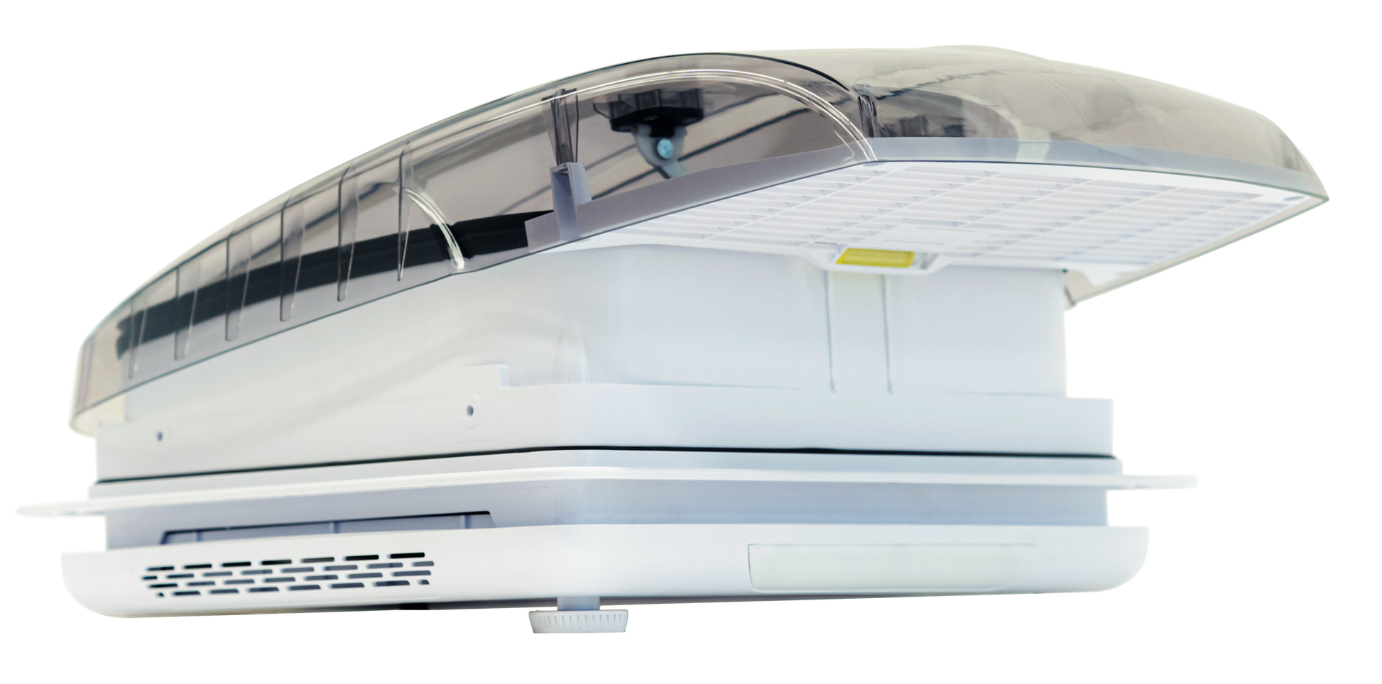GoCamp taklucka 400 Plus Fan 400 x400 mm med inbyggd fläkt, automatläge, mörkläggningsgardin och myggnät. För taktjocklek 27-80 mm.