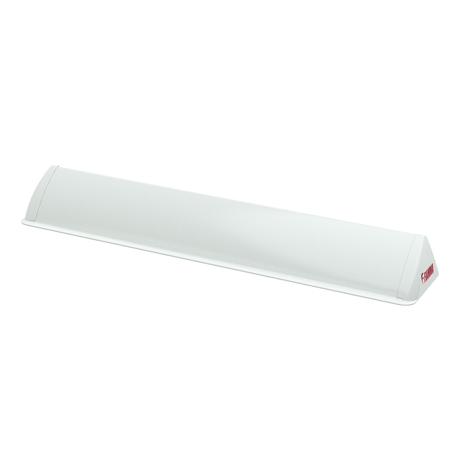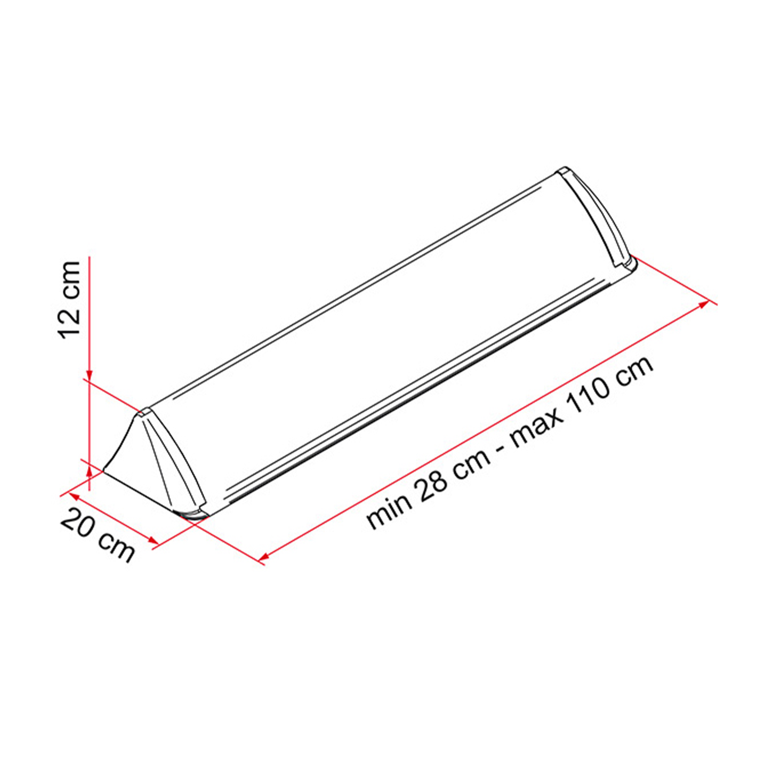 En vidareutveckling av Fiammas beprövade takspoiler, nu i ett utförande som kan justeras i längd från 28 till 110 cm för att passa takluckor och takfönster upp till 90 cm bredd. Tillverkad av UV-beständig PVC med ändstycken av ABS-plast. Monteras med Sikaflex, helt utan borrning i taket. Mått: 110 x 20 x 12 cm.