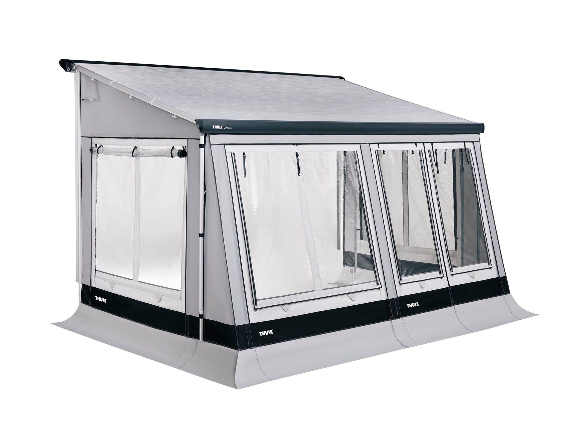 Thule Veduta tältet finns i fyra längder från 400 till 500 cm och kan endast användas i kombination med en takmarkis Thule Omnistor 6300 eller 6200 på en husvagn med monteringshöjd 245-259 cm. Den sluttande frontpanelen skapar extra känsla av rymd invändigt. Samtliga fönster är utrustade med myggnät.