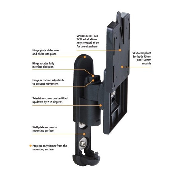 TV-fästet Vision Plus Short Arm är ett lätt fäste tillverkat i plastkomposit. Fästet kan låsas under färd. Levereras med en adapter som monteras på TVn. Adaptern hängs på TV-fästet vilket gör att TVn är smidig att hänga upp och ta av. Fästet kan vinklas 10° upp eller ner.
