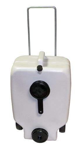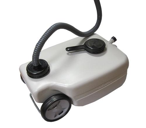 Komplett med avloppsslang för anslutning till vagnens avloppsrör. Rymd 25 liter. Mått: 500 x 335 x 240 mm. Utrustad med hjul och infällbart drag handtag av stål.
