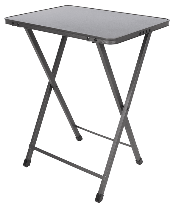 Ett lätt och stabilt bord som passar utmärkt som avlastningsbord. Lätt att fälla upp och ner, tar liten plats och väger endast 2,8 kg. Benen är tillverkade av 20 x 15 mm aluminium och har en snygg grålackerad finish. Bordet levereras med en förvaringsväska.